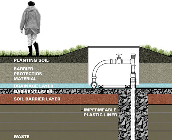It starts life as a quarry, with valuable material extracted from the earth to make a hole. The site then has a life as a landfill, where operators charge to fill the hole back up with the surrounding community's waste. The "after life" stage can include some sort of development on the site.